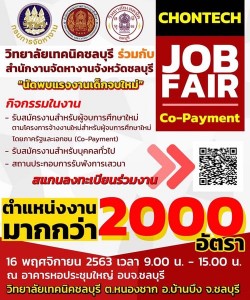 ขอเชิญร่วมงาน JOB FAIR Co-Payment วิทยาลัยเทคนิคชลบุรี ร่วมกับ สำนักงานจัดหางานจังหวัดชลบุรี รับสมัครงานตำแหน่งงานว่างมากกว่า 2,000 อัตรา ผู้ที่จบการศึกษาใหม่ หรือผู้ที่ว่างงาน พบกันวันที่ 16 พฤศจิกายน 2563 ณ อาคารหอประชุมใหญ่ อบจ.ชลบุรี วิทยาลัยเทคนิคชลบุรี ต.หนองชาก อ.บ้านบึง จ.ชลบุรี